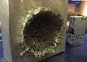 Voici le résultat de l' impact d'un morceau de plastique de quelques centimètres propulsé à 24 000 km/h sur un bloc d'aluminium. Ce test a été réalisé par la NASA pour étudier les risques liés aux débris spatiaux en orbite.